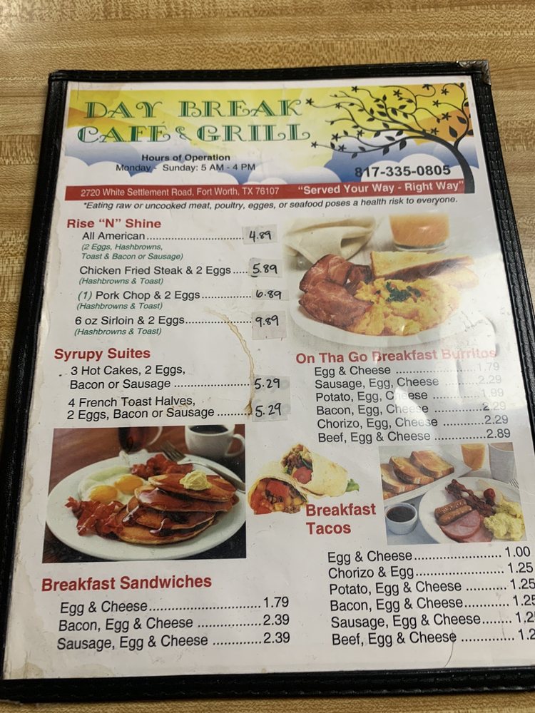 Welcome to Daybreak Cafe & Grill, a hidden gem located at 2720 White Settlement Rd, Fort Worth, TX. This charming spot specializes in Mexican breakfast and brunch offerings that are as delightful as they are affordable. From the moment you walk through the door, you're enveloped in a cozy, casual atmosphere that makes it perfect for families, groups, or anyone looking to savor a delicious meal.